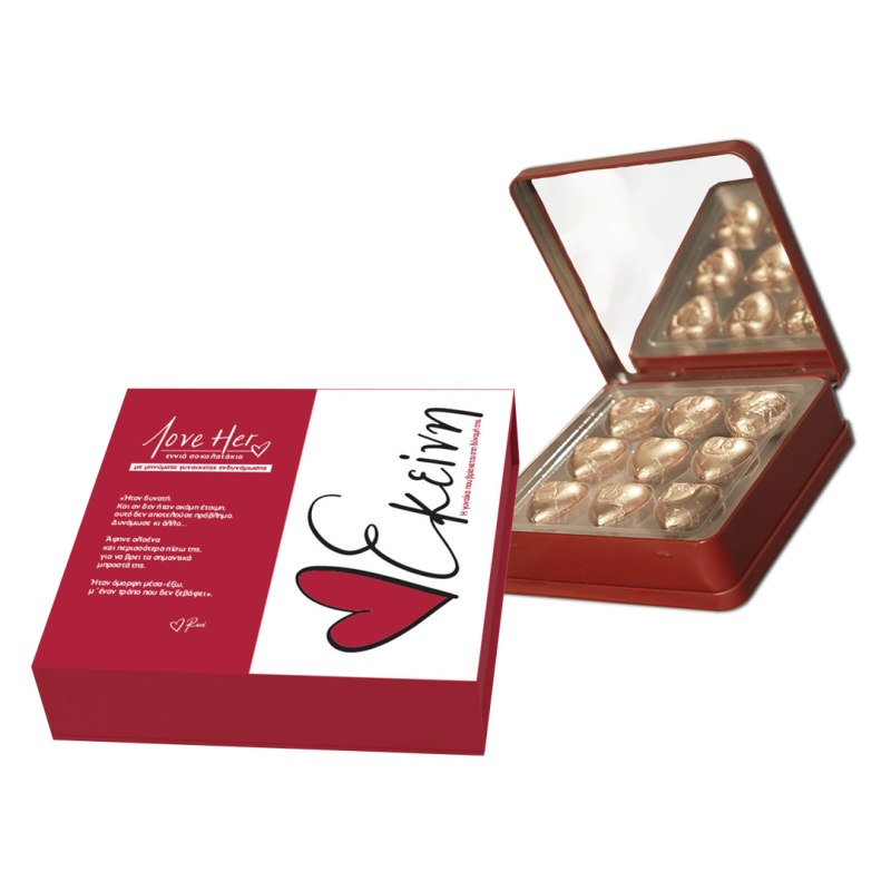 Ένα ιδιαίτερο σοκολατένιο δώρο για να της δείξεις πόσο την αγαπάς και να την κάνεις να νιώσει μοναδική. ♥ 8 πραλίνες σοκολάτας γάλακτος με γέμιση τρούφα κακάο ♥ μεταλλικό κουτί με καθρέφτη